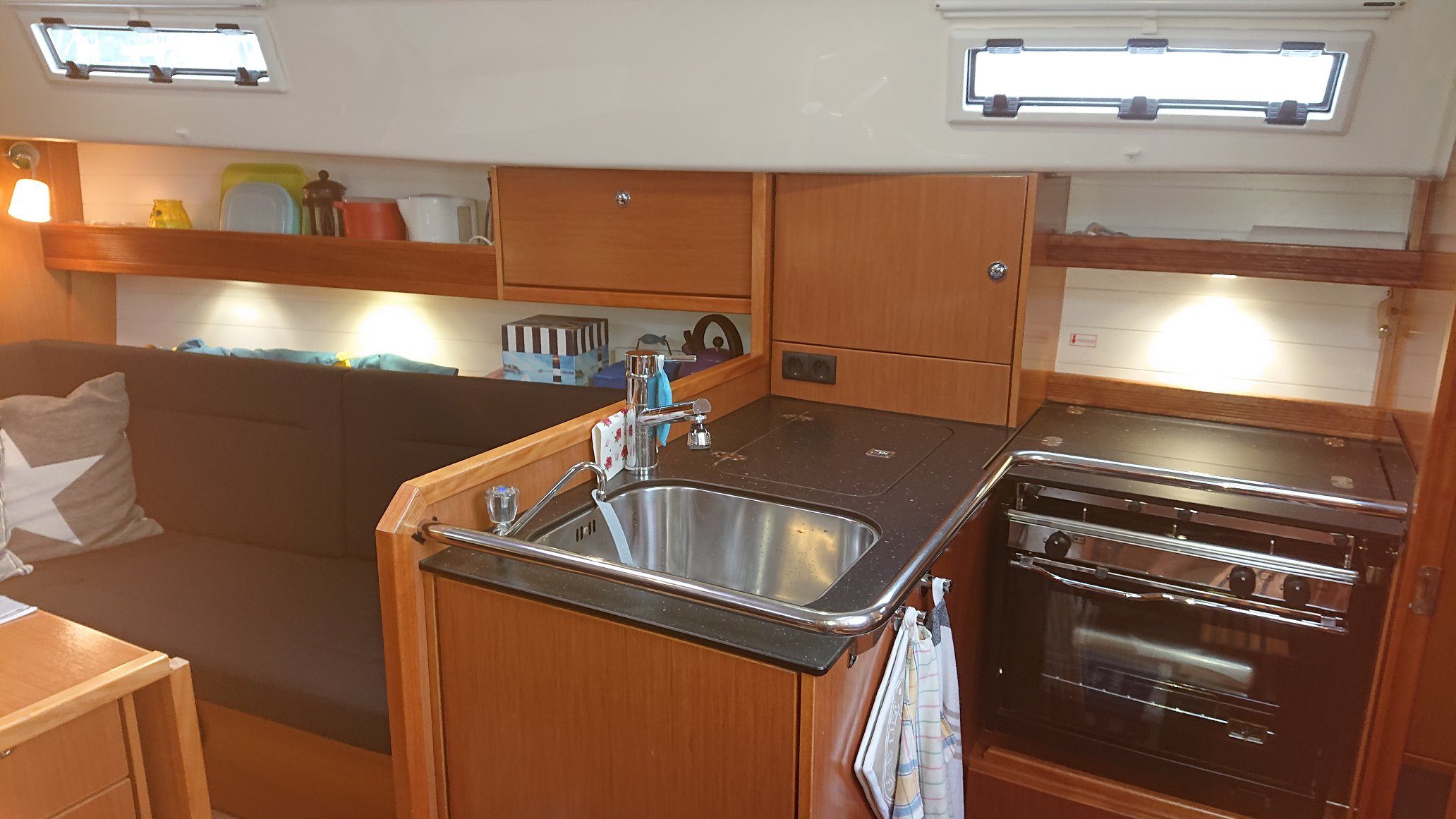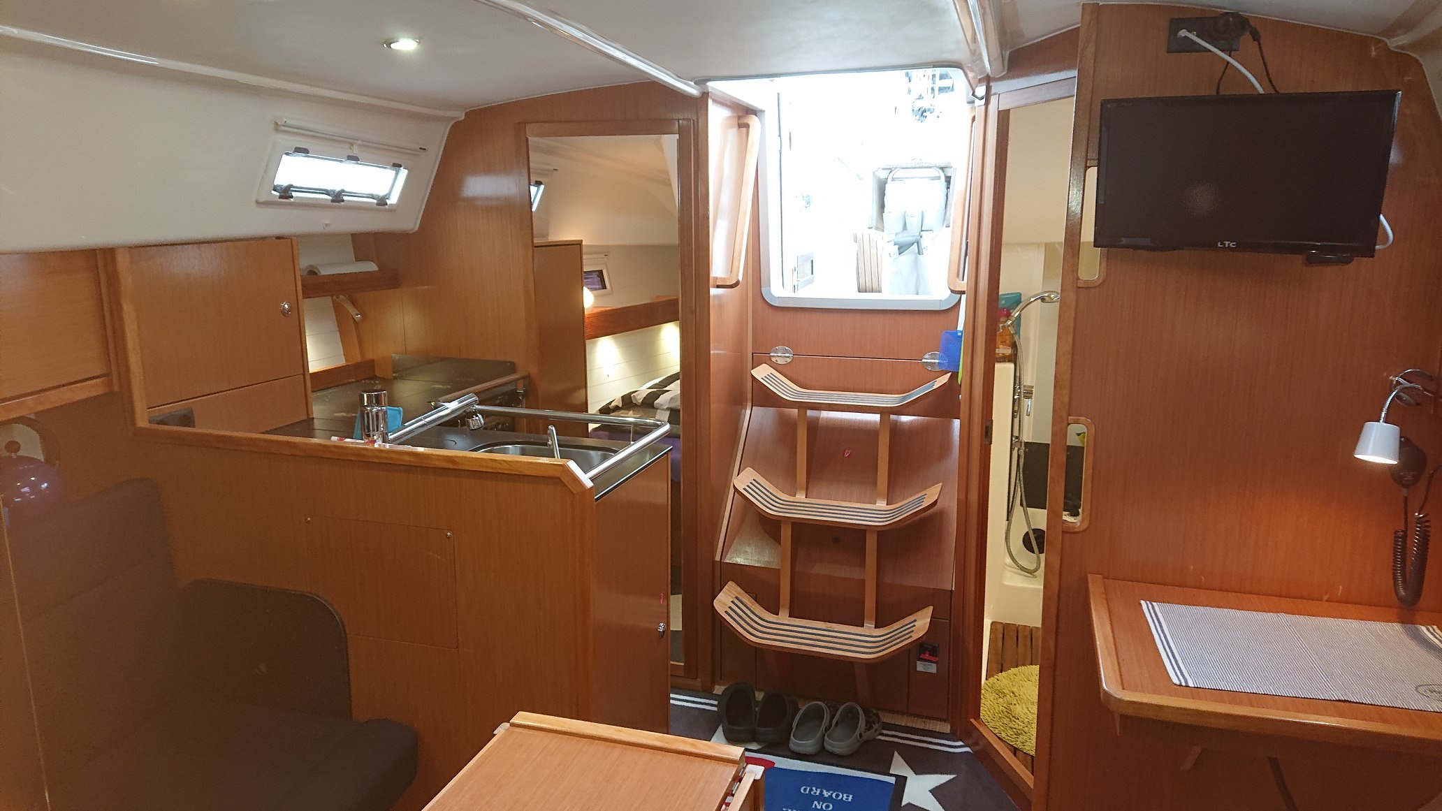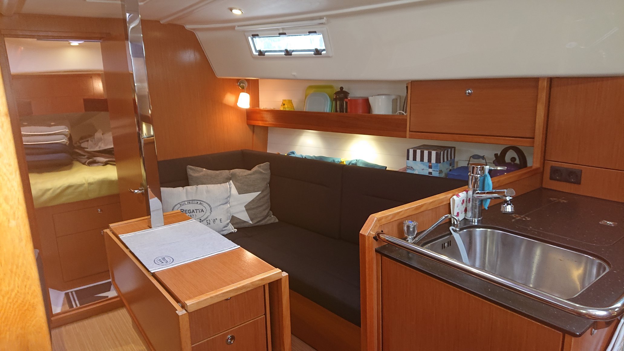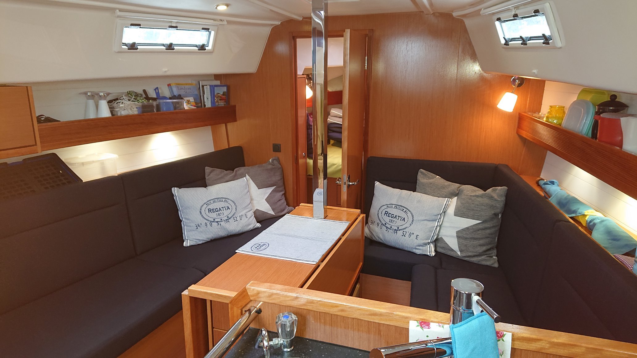 A fantastically well-equipped and spacious boat with, among other things, a bow thruster and windlass. There are also additional amenities such as hot water, kitchen equipment, TV and stereo in the cockpit with Ipod dock and remote control. In the spacious salon there are plenty of storage options and room for 2 people to sleep. A further 4 berths are distributed in the boat's 2 cabins. There is also a bathroom with hot water, shower and WC.