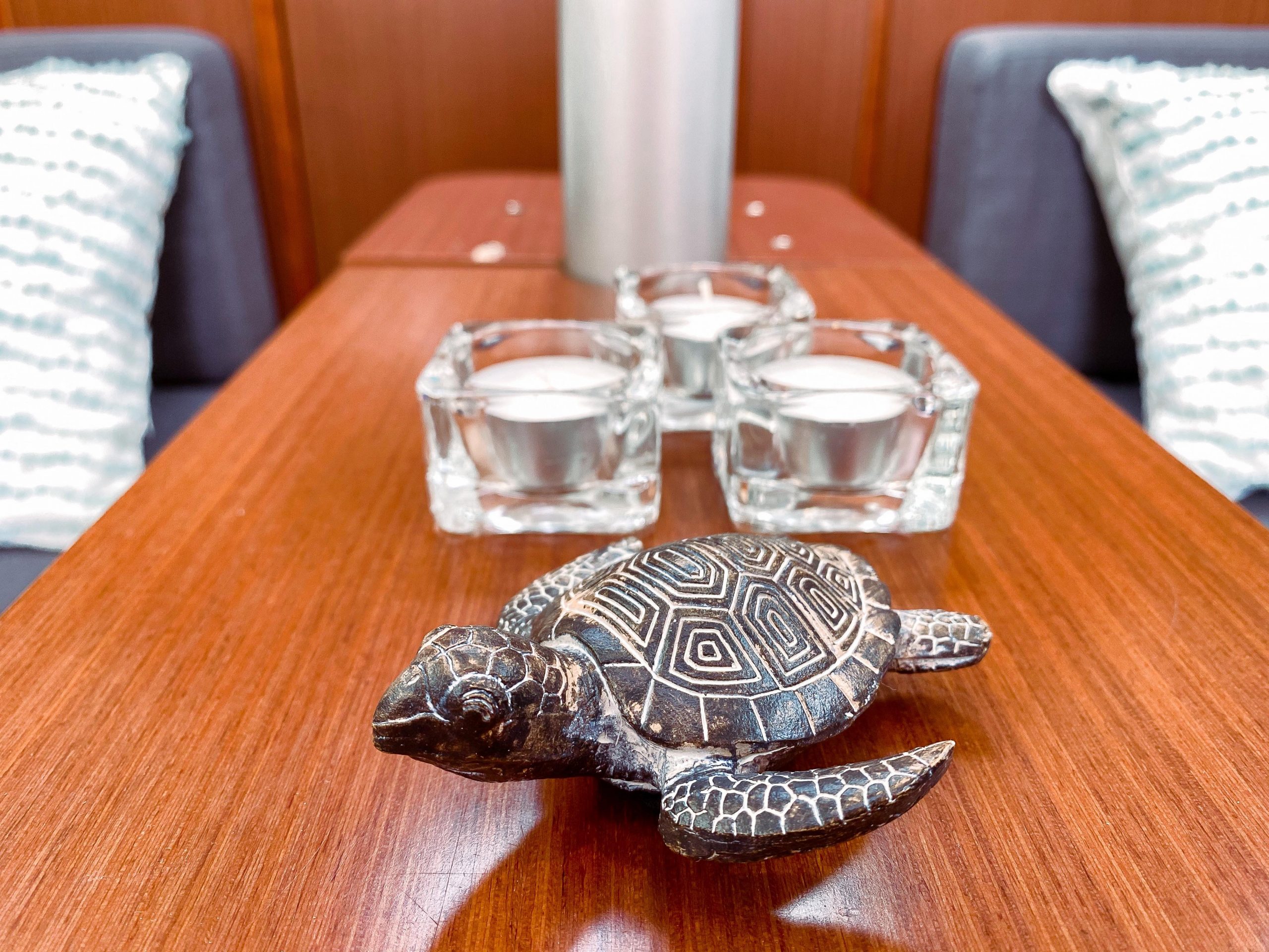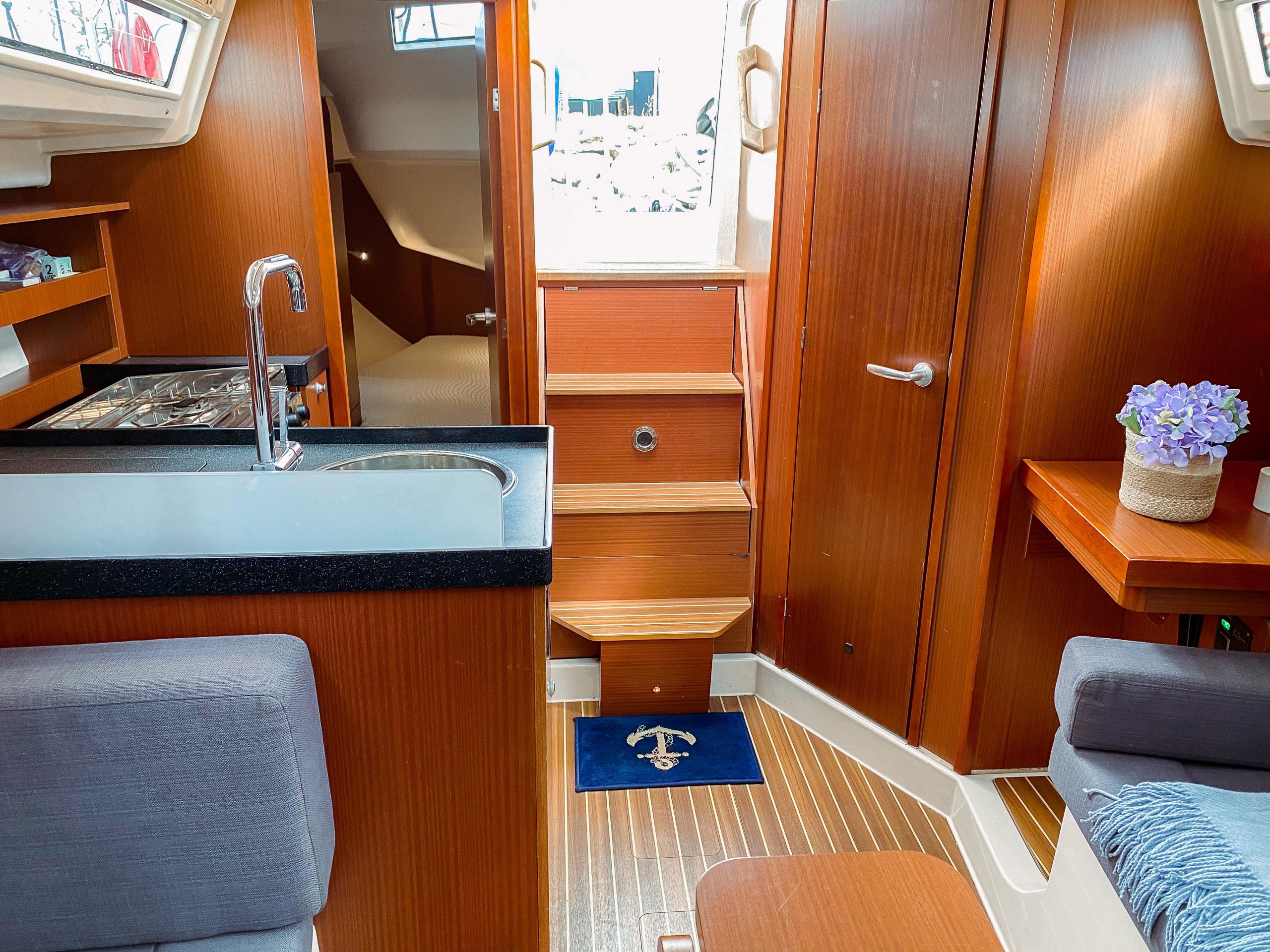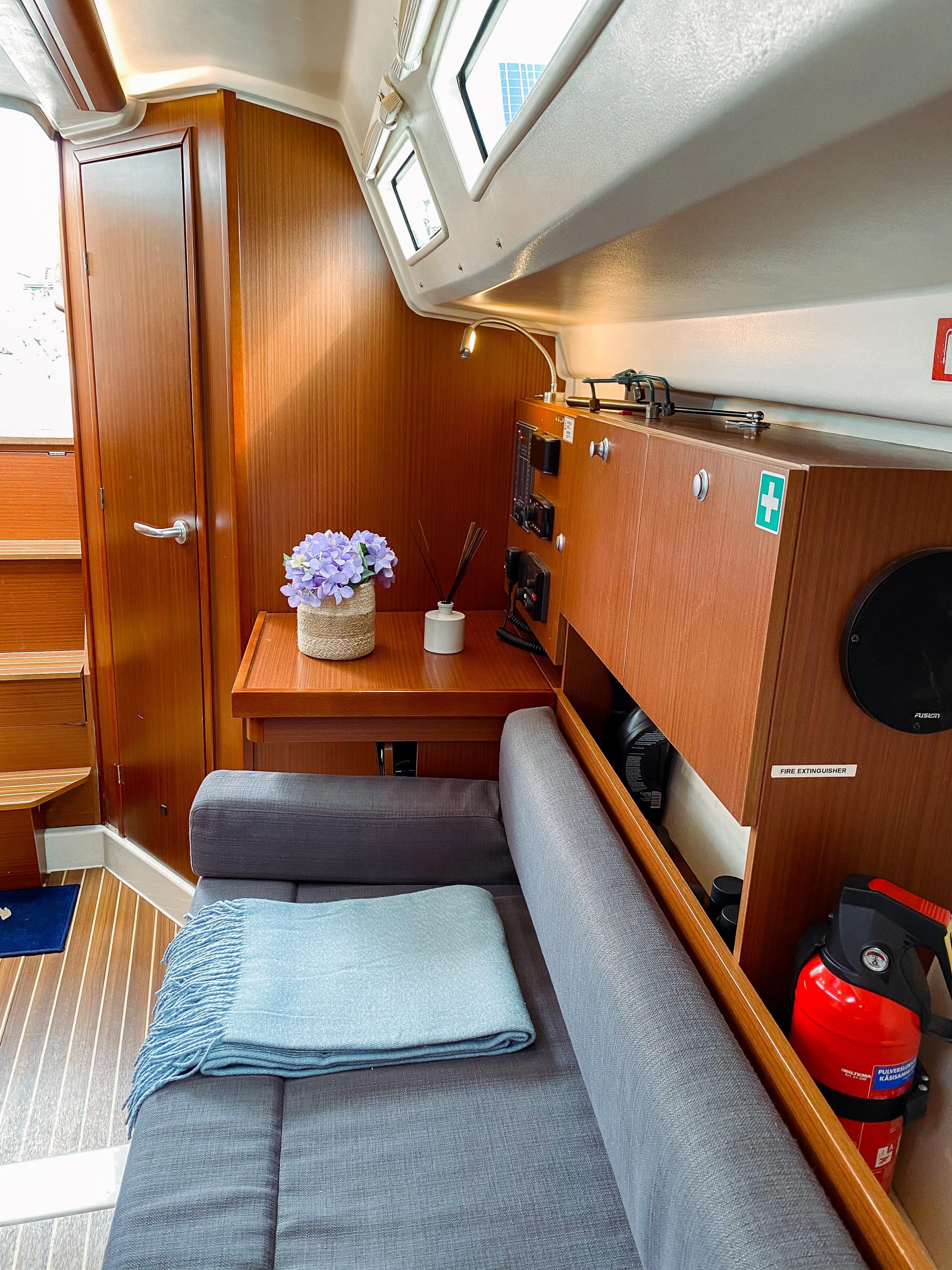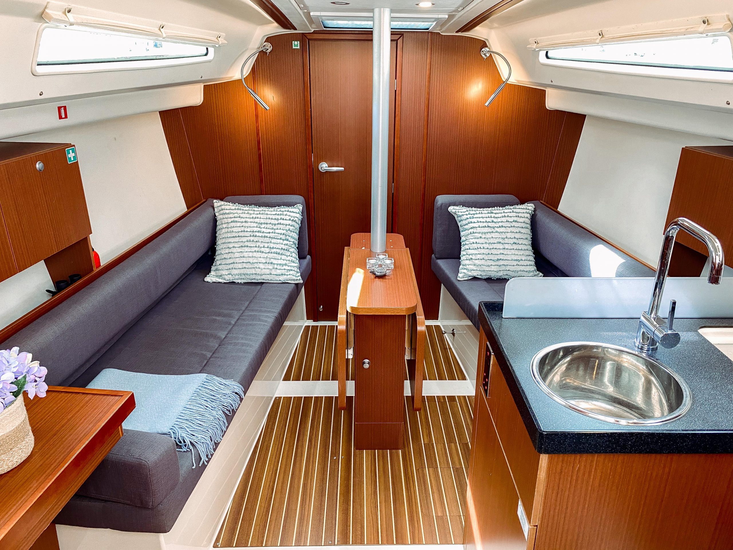 Hanse 315 offers fantastically spacious spaces and everything the family or friends could possibly need for a first-class holiday on the lake. There are two generous cabins with double berths and a toilet with hot water and shower. The sofa group in the lounge can accommodate 6 people and there is a stereo with Bluetooth connection. The boat's cockpit is larger than most boats of the same size and offers plenty of room for several people. The Hanse 315 is easy to handle and has a self-tacking furling jib, it fits most sailors and is thus the perfect family cruiser. Here there is the possibility to sail shorter excursions or longer tours.