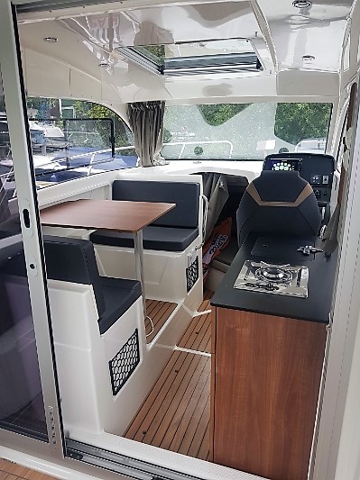 The dining area accommodates four people around the table, but can also be easily converted into forward-facing seating. Another seating area is on the aft deck. Sleeping places for 4 people are distributed in two cabins, each with a double bed and a separate bathroom with WC and shower. In the kitchenette there is a fridge, stove and water.